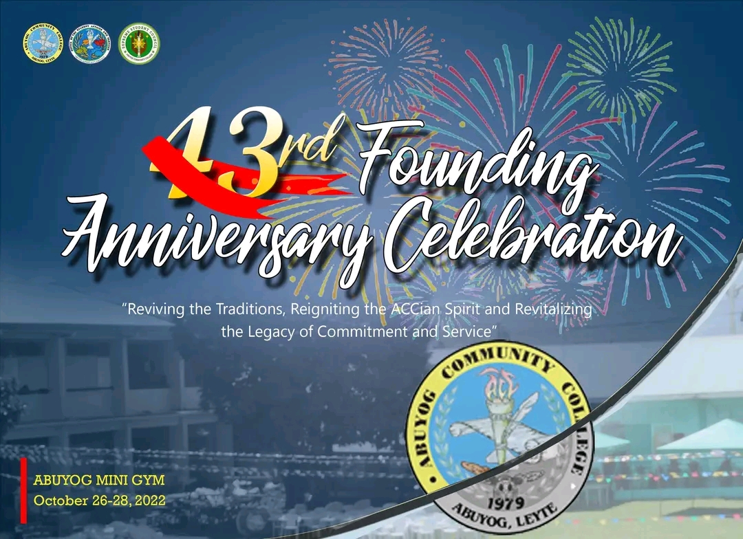 ACCians, brace yourselves in the celebration of the 43rd Founding Anniversary of our dear institution, Abuyog Community College with the theme, "Reviving the Traditions, Reigniting ACCian Spirit and Revitalizing the Legacy of Commitment and Service", this coming October 26-28, 2022!